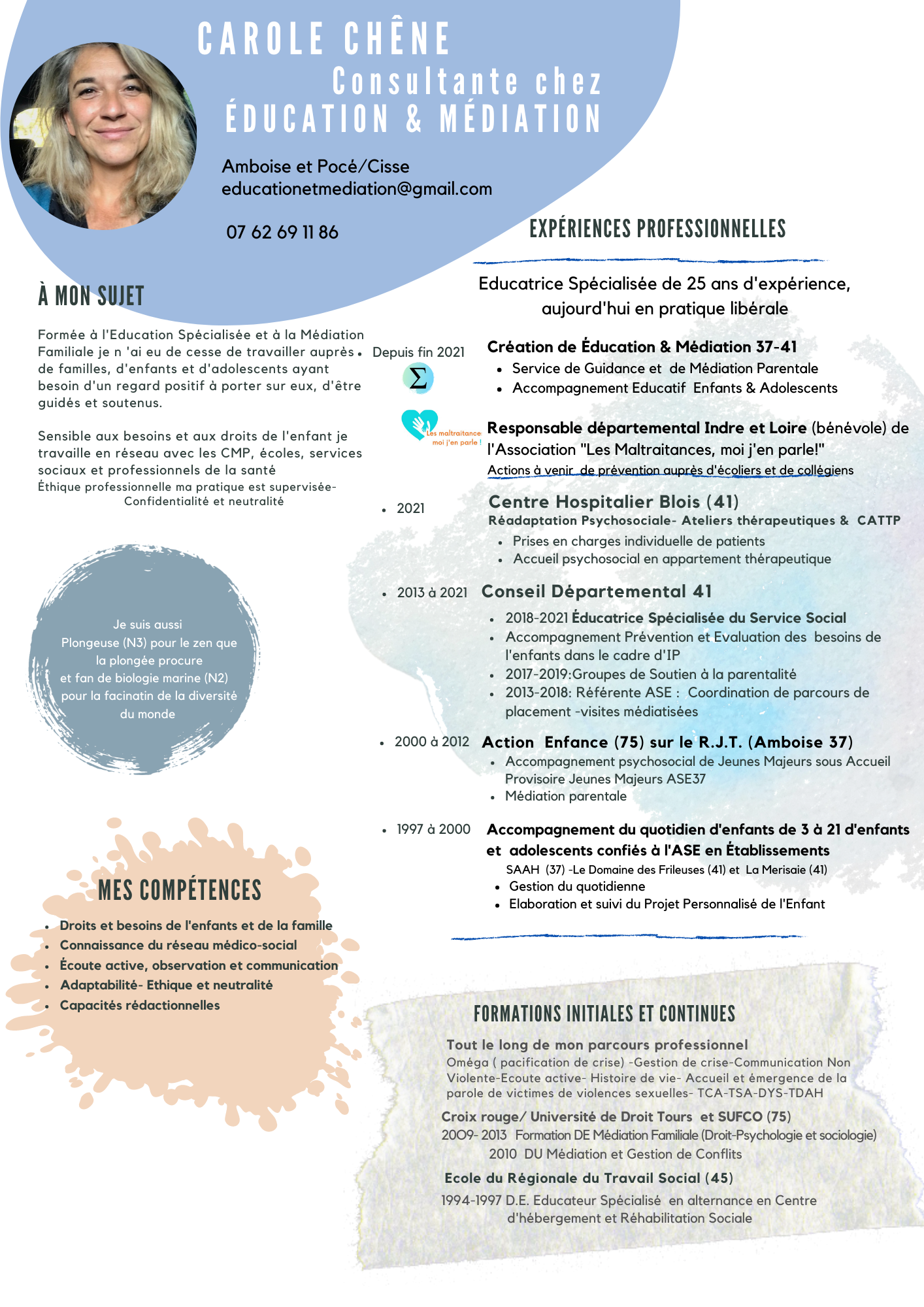 J’ai intégré la Protection de l’Enfance, du Département du Loir et Cher comme référente du parcours de placements d’enfants confiés, j’ai soutenu leur quotidien en famille d’accueil, ou en établissements médico-sociaux et médiatisé la reprise de lien avec leur parents parce qu’un placement n’a pas vocation à être pérennisé. J ‘ai travaillé auprès des familles et des parents afin de les aider à reprendre confiance dans leur rôle, les guider pour faire (ré) émerger leurs compétences et les équiper de solutions solides pour l’avenir e leur enfant.